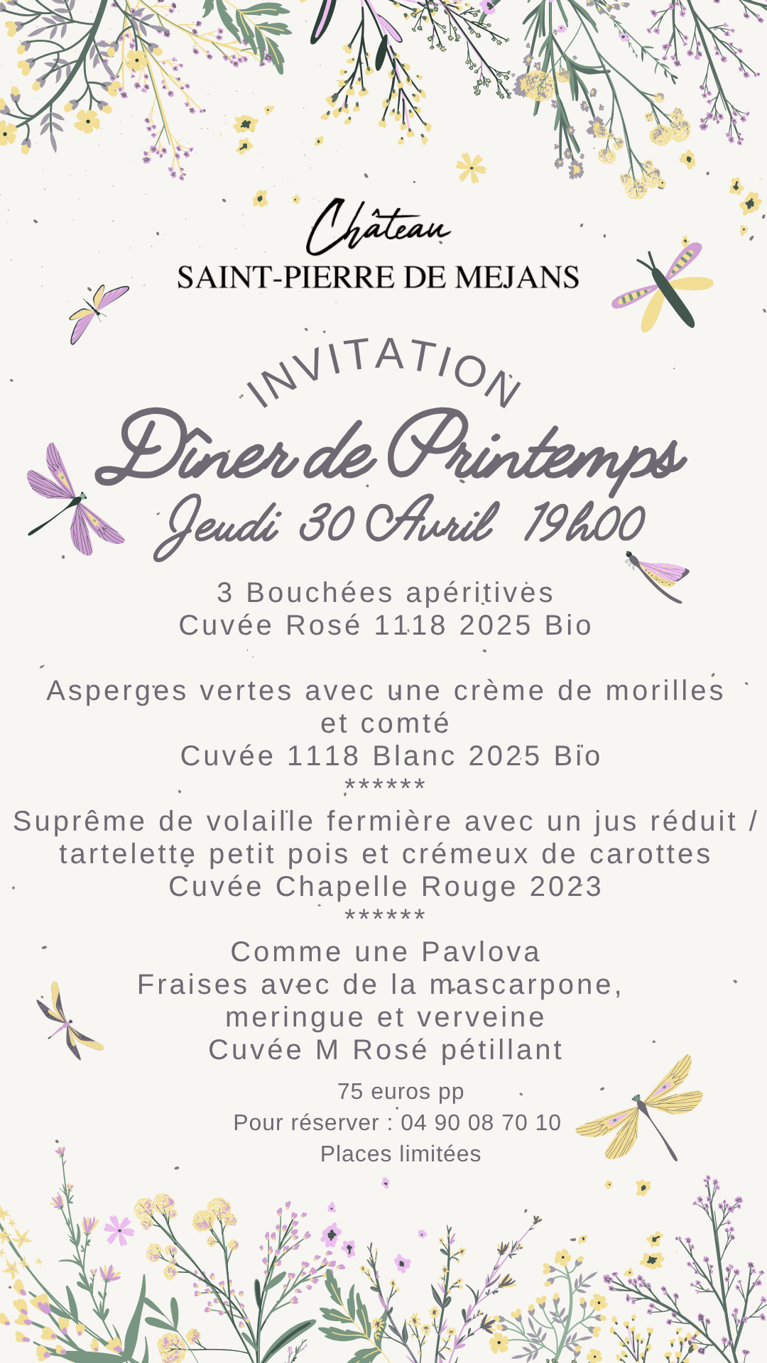Spring Dinner at Château Saint-Pierre de Méjans: a gourmet menu paired with the estate’s organic wines. A friendly evening celebrating seasonal flavours. Limited seats.