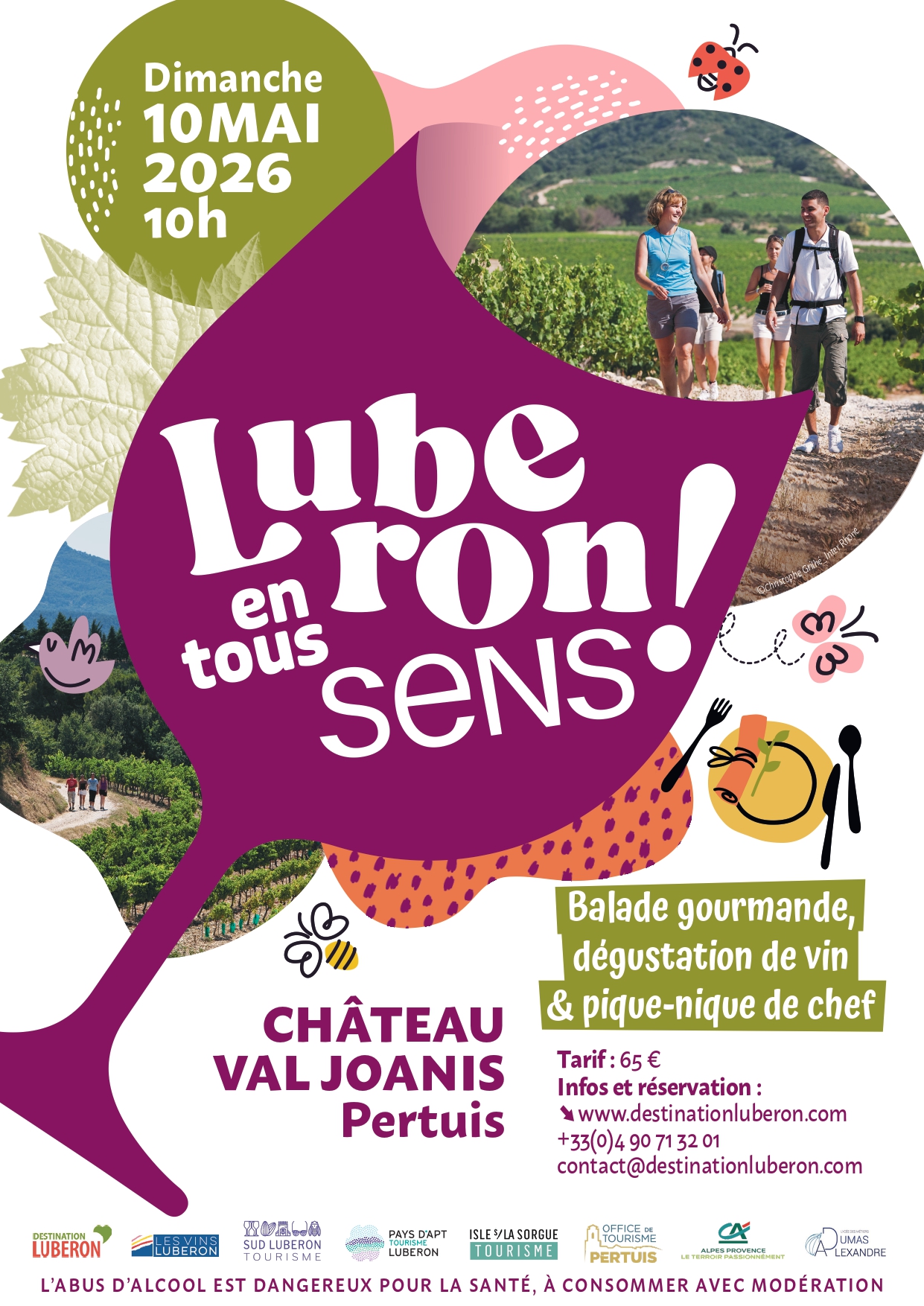 Luberon en Tous Sens returns on Sunday, May 10, 2026, at Château Val Joanis in Pertuis. Enjoy a 7 km gourmet hike through the Luberon vineyards, with tasting stops and meetings with passionate winemakers, including Domaine du Coffre.